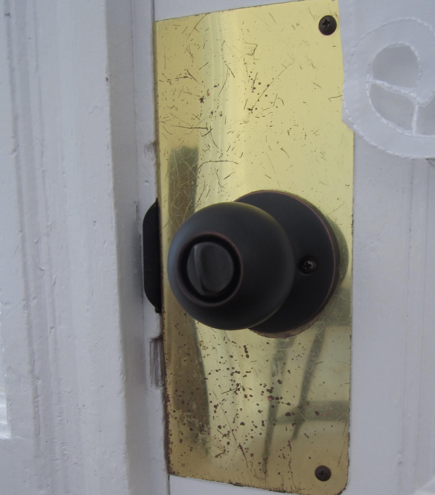 Overall it looks great compared to the old beat up brass. Since this is a custom plate on the 116 year old door, painting was the most logical choice. I plan on keeping the door as is where you can see that there was on old decorative plate at one time. It just adds more historical character!